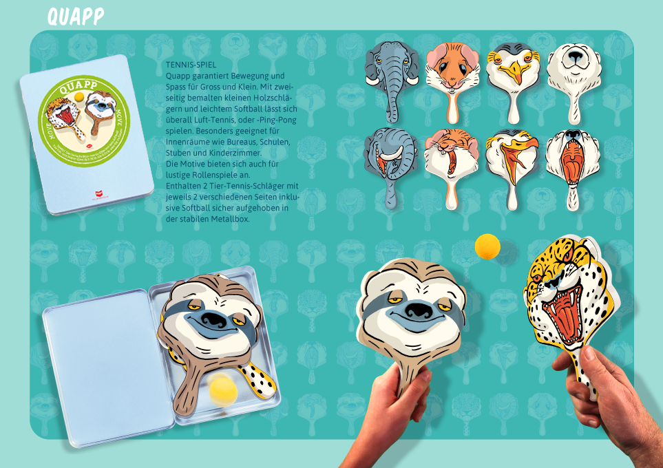 Quapp garantiert Bewegung und Spass für Gross und Klein. Mit zweiseitig bemalten kleinen Holzschlägern und leichtem Softball lässt sich überall Luft-Tennis, oder -Ping-Pong spielen. Besonders geeignet für Innenräume wie Bureaus, Schulen, Stuben und Kinderzimmer. Die Motive bieten sich auch für lustige Rollenspiele an. Enthalten 2 Tier-Tennis-Schläger, Jaguar und Faultier mit jeweils 2 verschiedenen Seiten inklusive Softball sicher aufgehoben in der stabilen Metallbox.